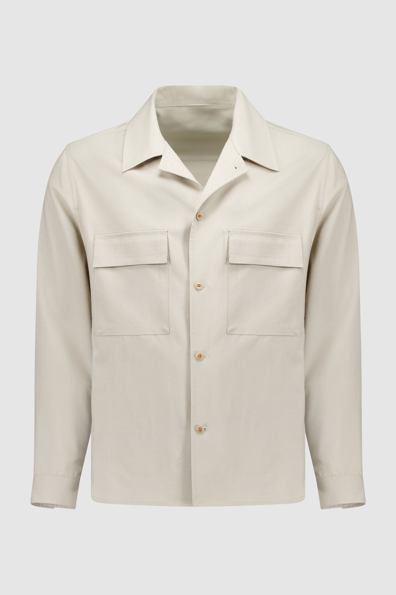 Overshirt con sei bottoni e due tasche applicate. Il modello è alto 188 cm e indossa la taglia 50.