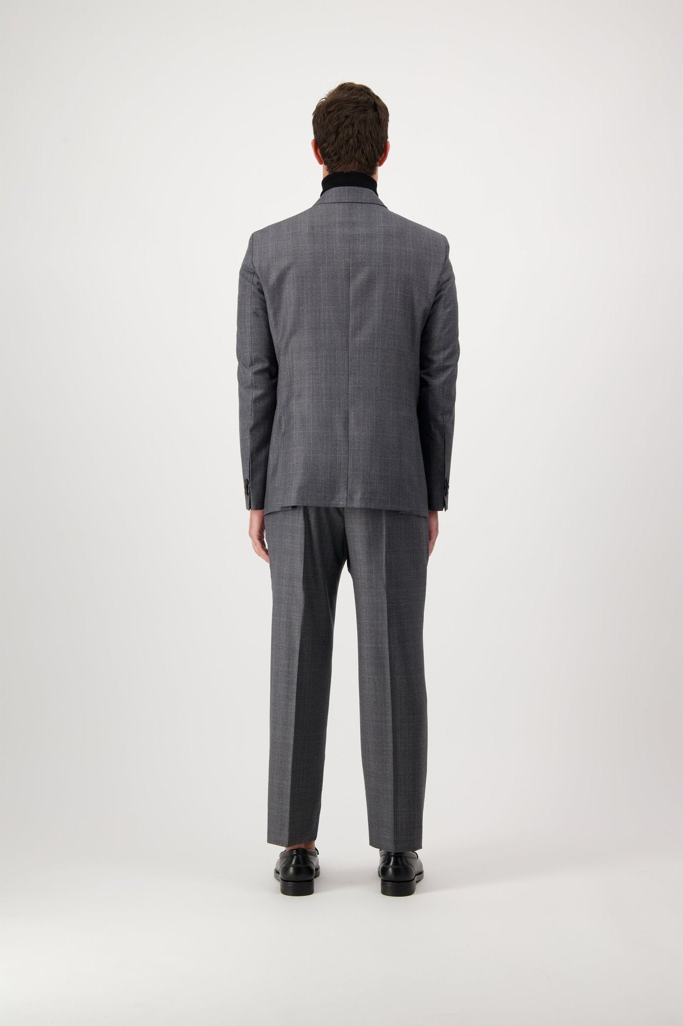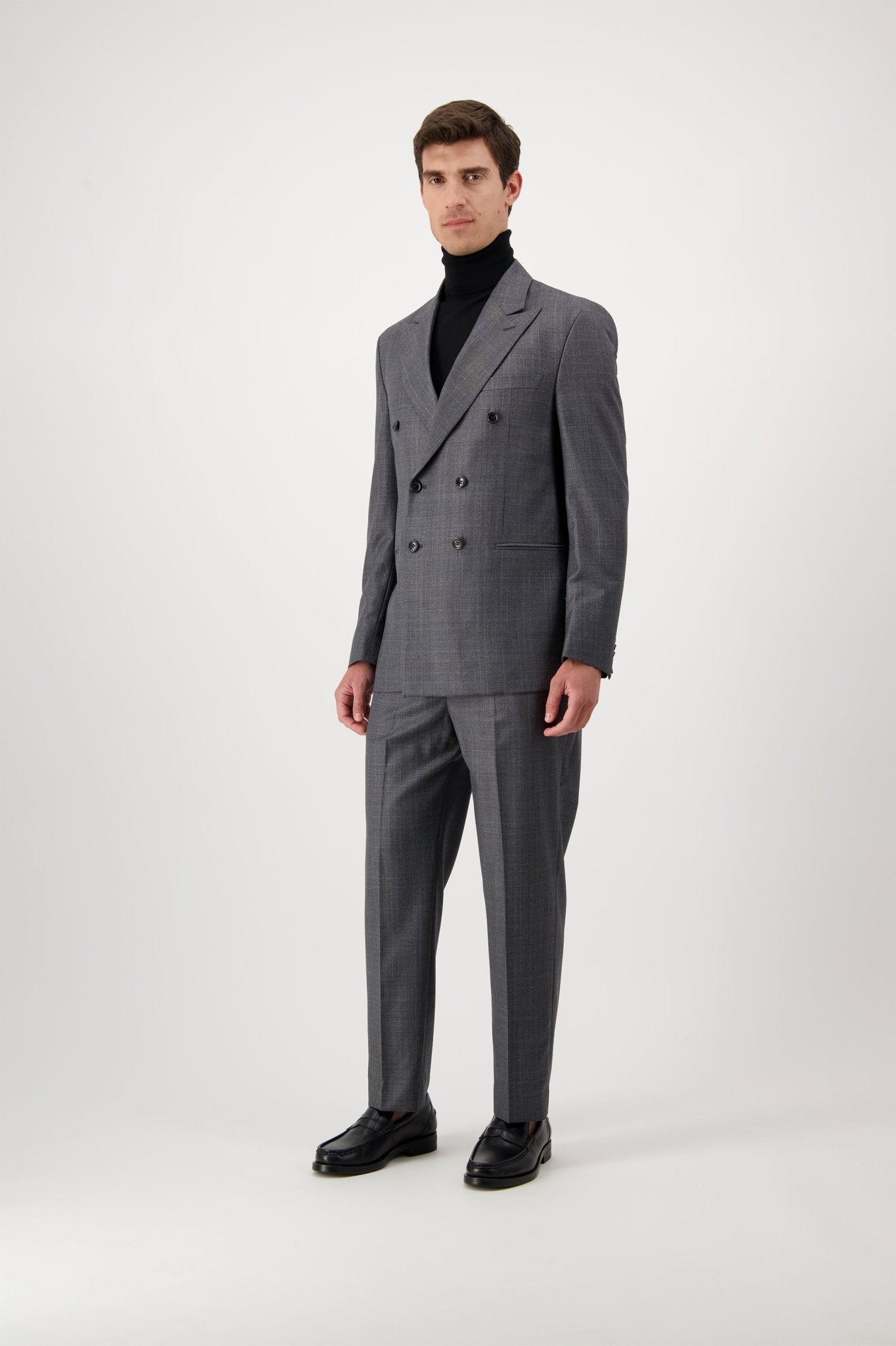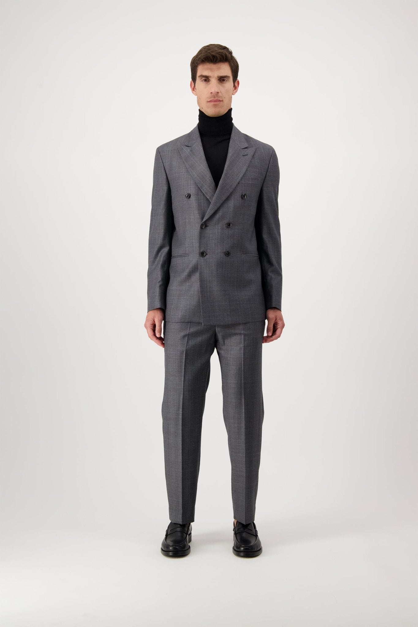 Giacca doppiopetto con revers a lancia, tasche e taschino a filetto. Polsino dritto con 3 bottoni.
