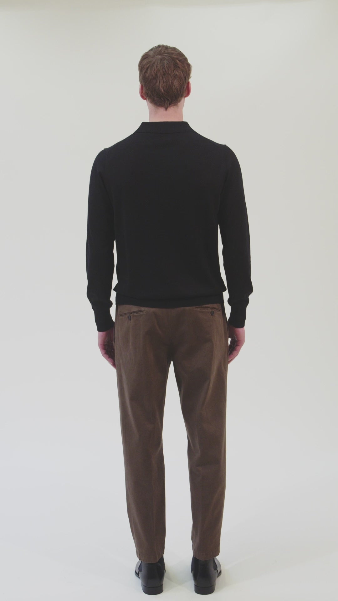 Elegante polo in maglia rasata finezza 16, impreziosita da tre bottoni e realizzata in pregiata lana Merino. La silhouette raffinata si adatta perfettamente alla figura maschile. Il nostro modello, alto 185 cm con misure 95 cm di petto, 82 cm di vita e 92 cm di fianchi, indossa una taglia L per una vestibilità ideale.