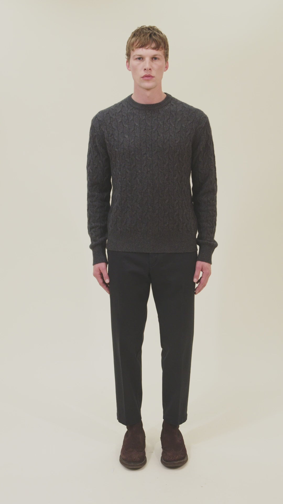Maglia girocollo con lavorazione a treccia. Finezza 7 - 2 fili.