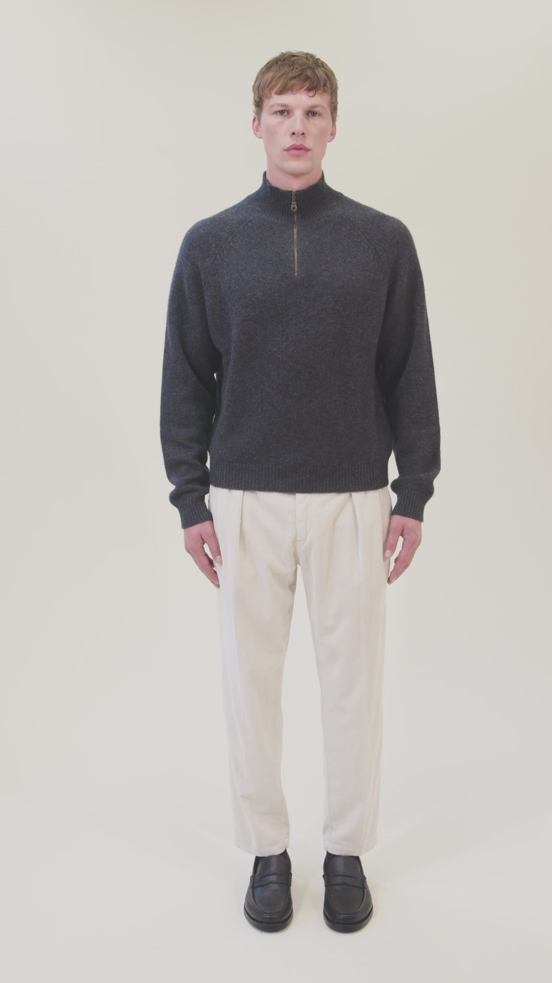 Maglione a collo alto con spalle raglan, elegantemente realizzato con un design a mezza zip, lavorato a maglia a triplo filo calibro 5 in misto lana e cashmere.