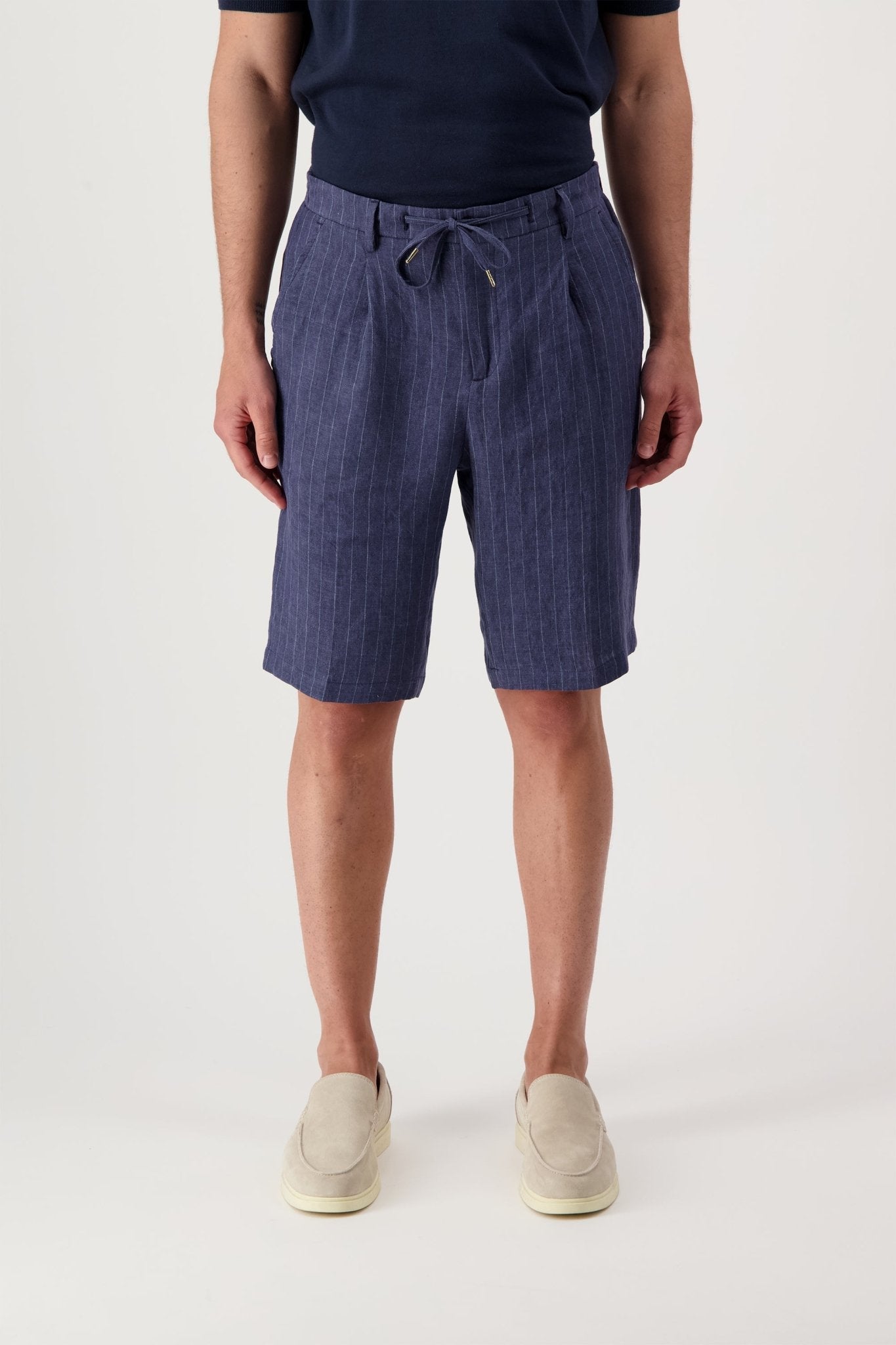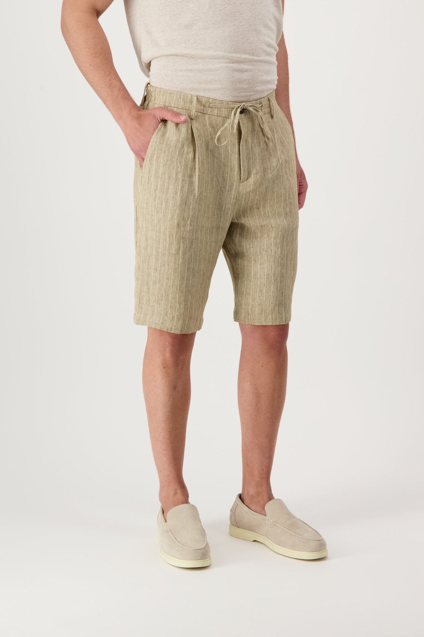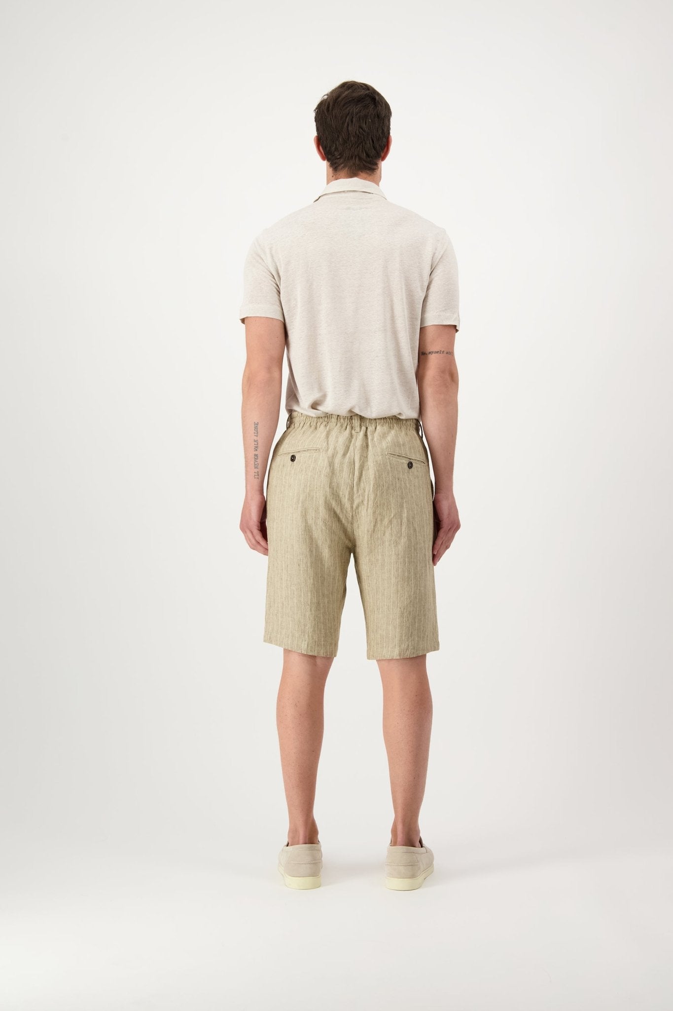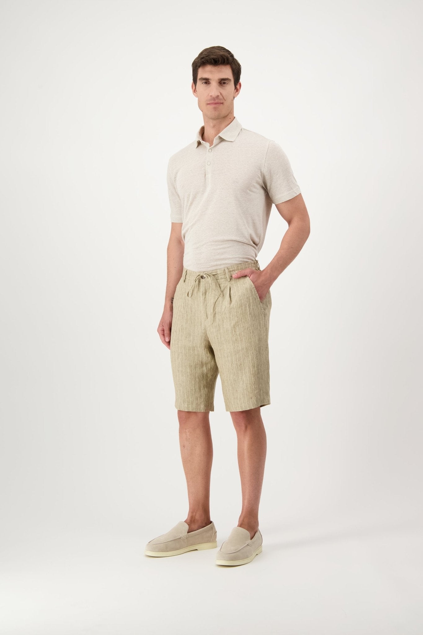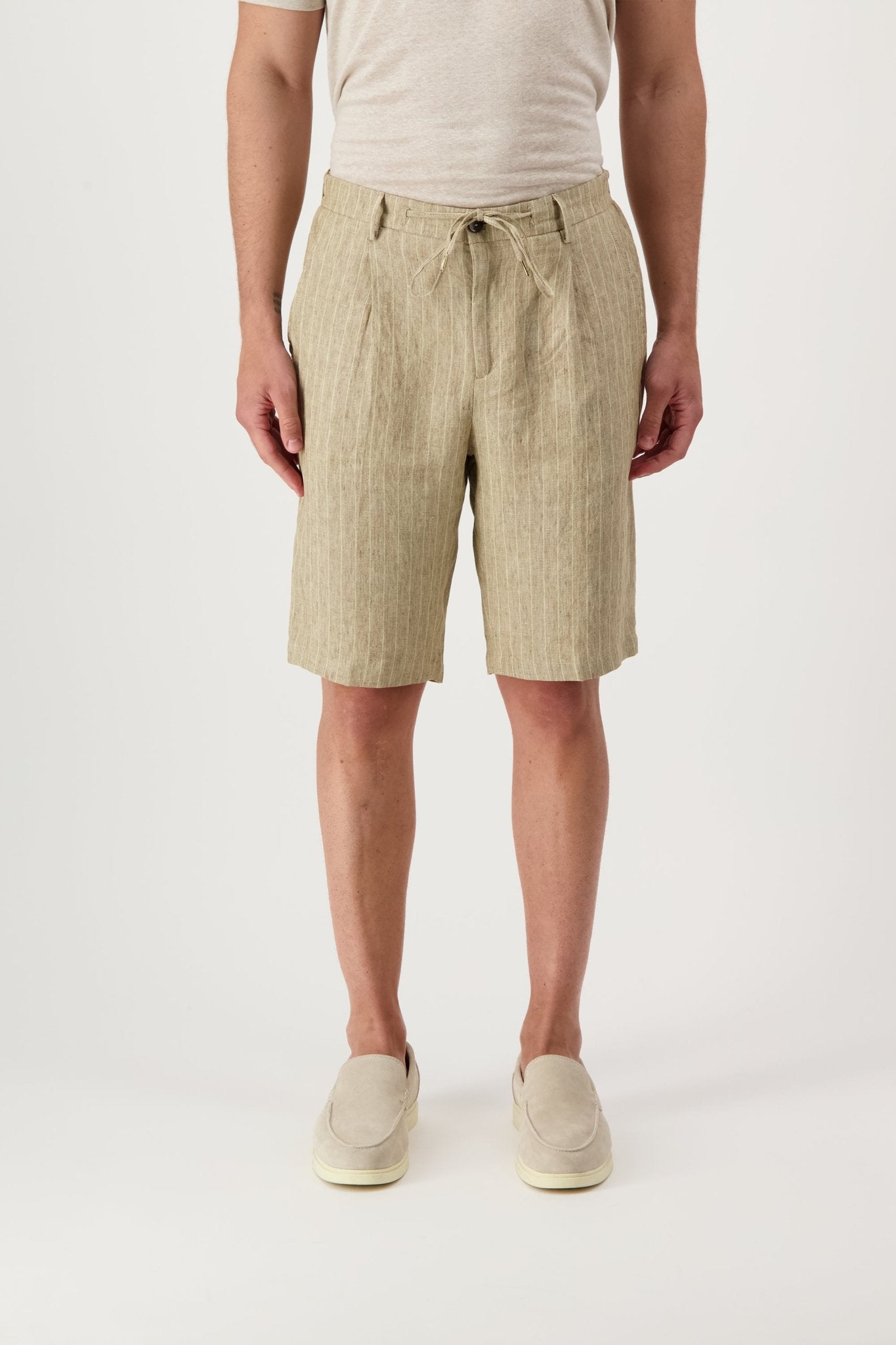 Pantaloncino in lino con tasche America e chiusura con zip. Il modello è alto 188 cm e indossa la taglia 50.