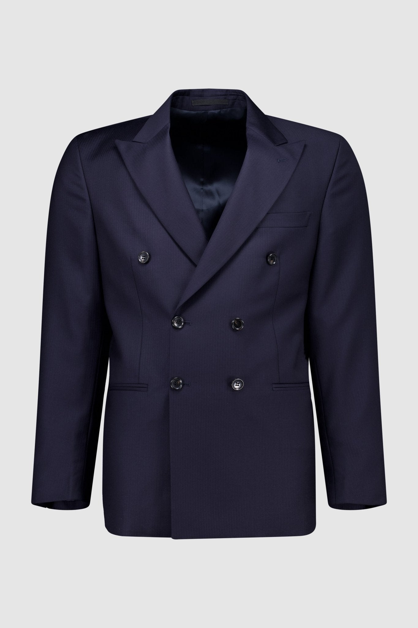 Giacca: Giacca doppio petto con bavero a lancia, tasche e taschino a filetto. Polsino dritto con 3 bottoni.